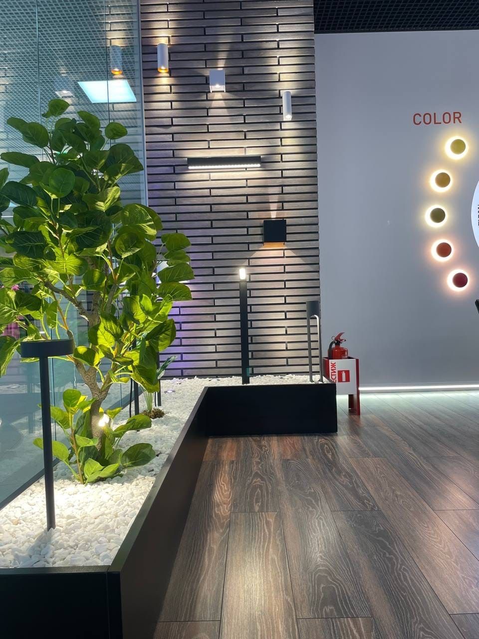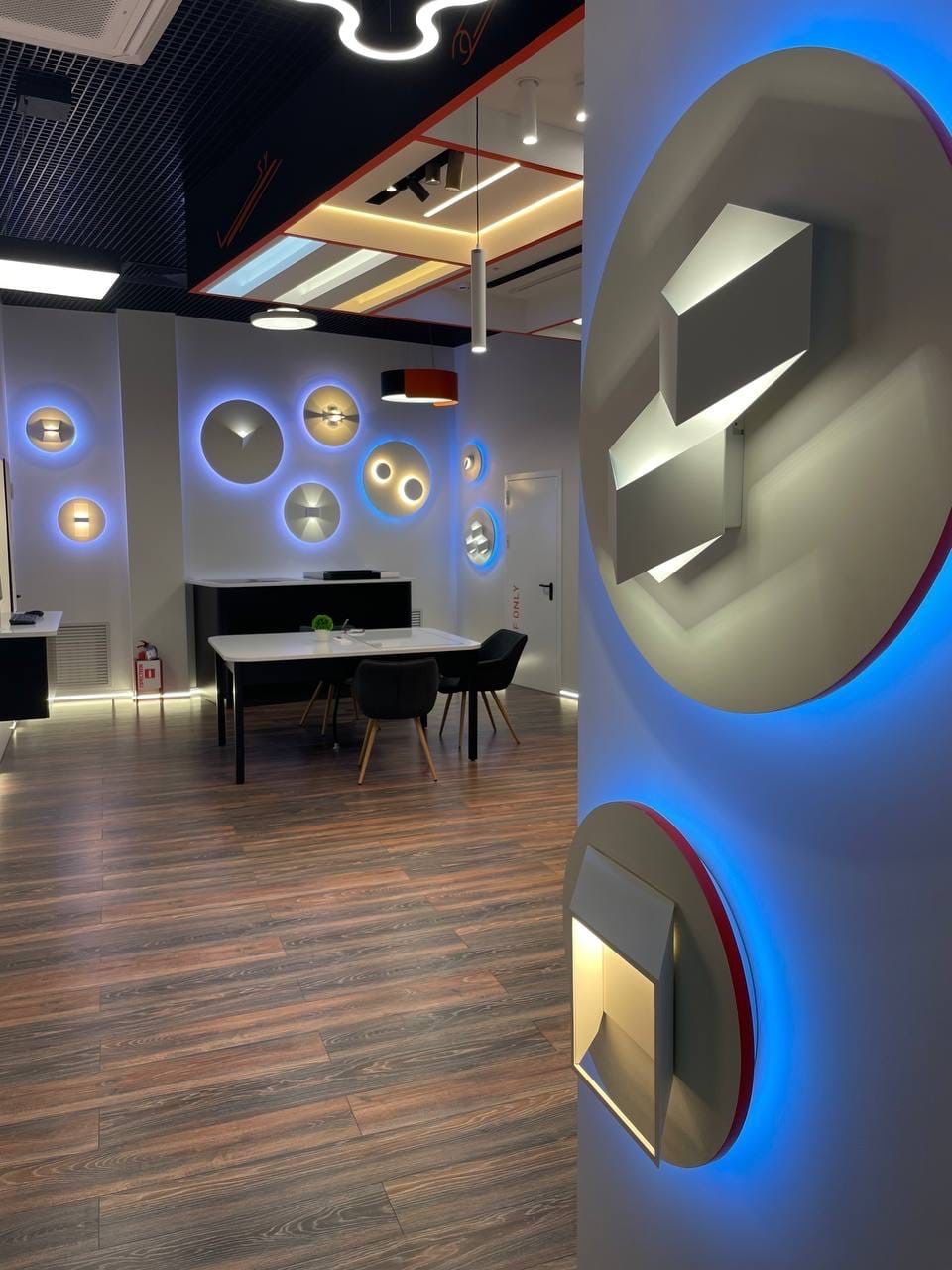 В шоуруме сделан акцент на наглядность: потолочная экспозиция с разными типами светильников и треком, отдельные зоны под “встраиваемые” решения и демонстрация акцентного света на стене. Есть стол для подбора и обсуждения проекта — удобно прийти с планом/фото и быстро собрать комплект: ленты и профили для подсветки, питание с запасом, управление (диммирование/сценарии), трековые системы и светильники.