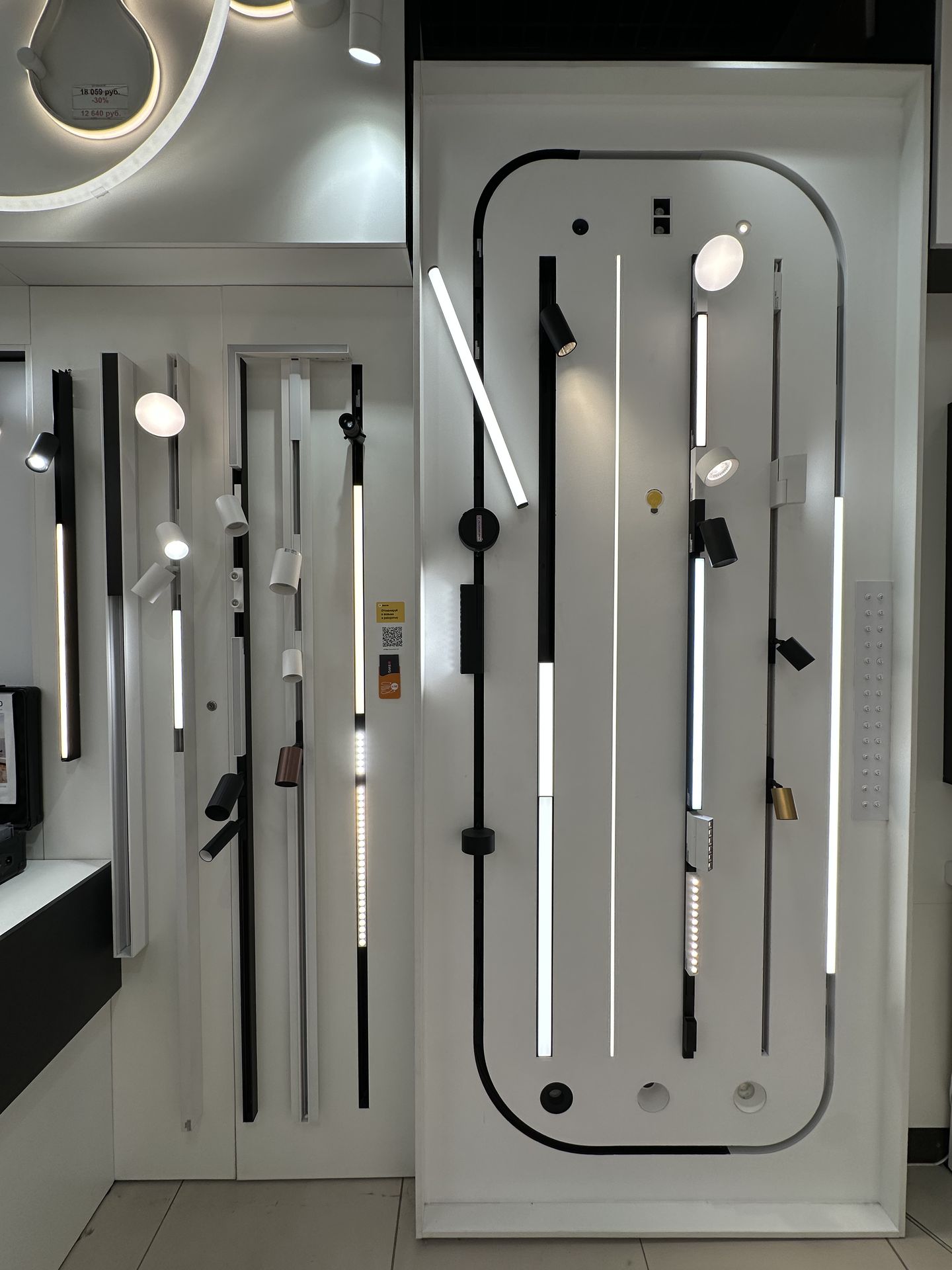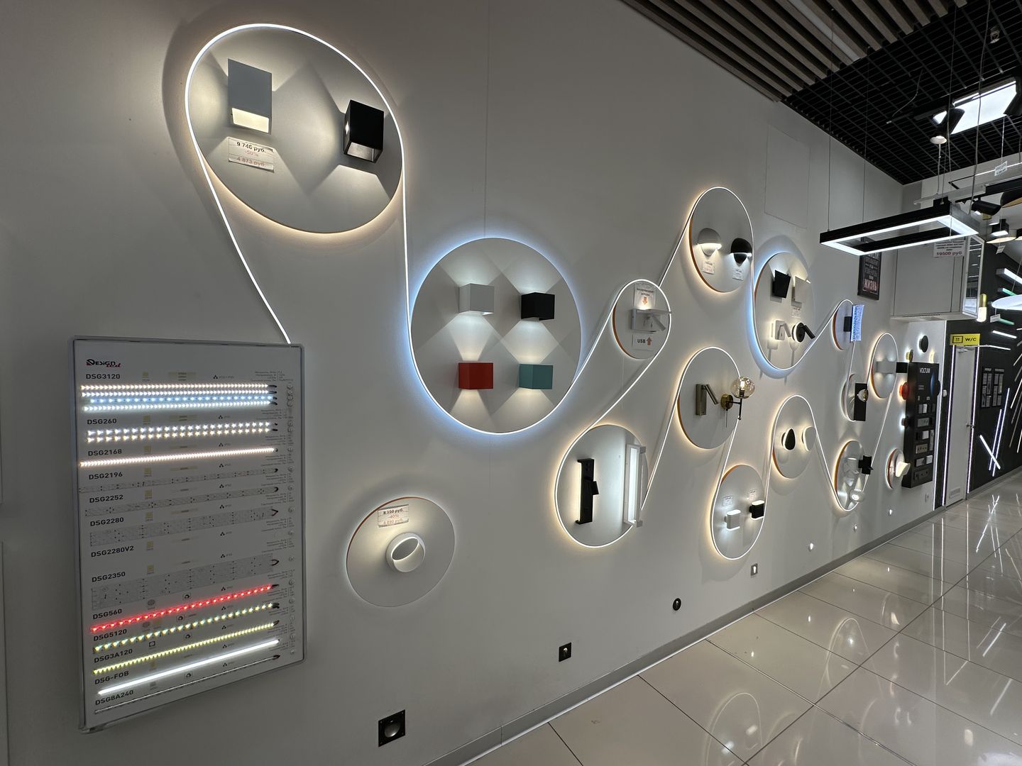 Формат магазина — «посмотреть и сравнить»: у входа заметная вывеска SWG, внутри вдоль прохода — демонстрационные ниши и стенды, а на стенах — световые композиции и образцы, где видно, как работает рассеивание и акцентный свет. Это особенно полезно, когда выбираете не «по параметрам на коробке», а по тому, как свет выглядит в пространстве.