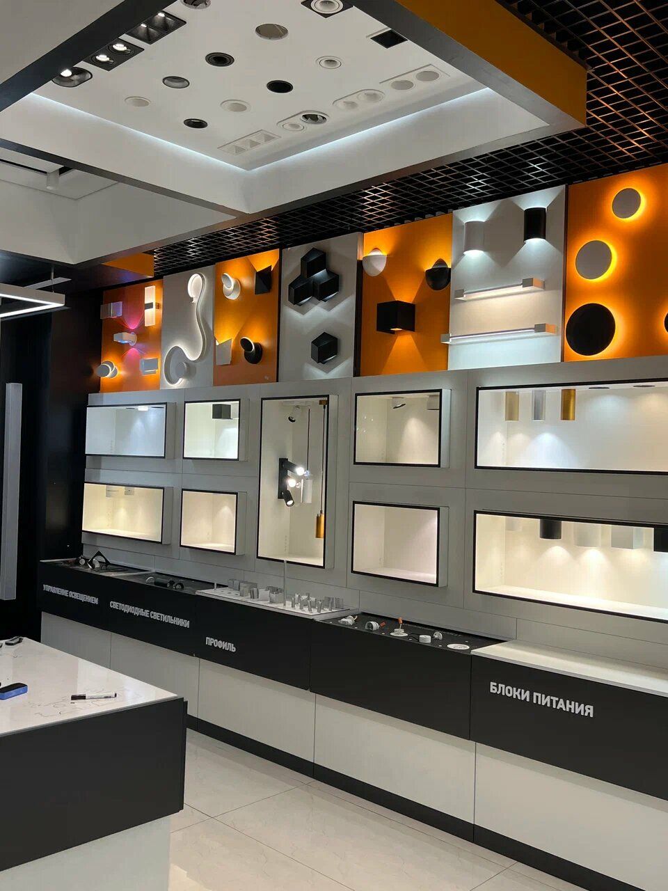 В экспозиции показаны разные типы света: подвесные кольца и декоративные модели, трековые светильники и линейные решения, плюс стенды с образцами подсветки. Такой формат помогает быстро выбрать направление: что лучше для общего света, что — для акцентов, и как будет выглядеть подсветка в нишах/на стене.