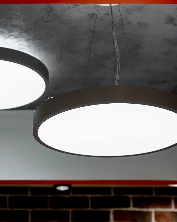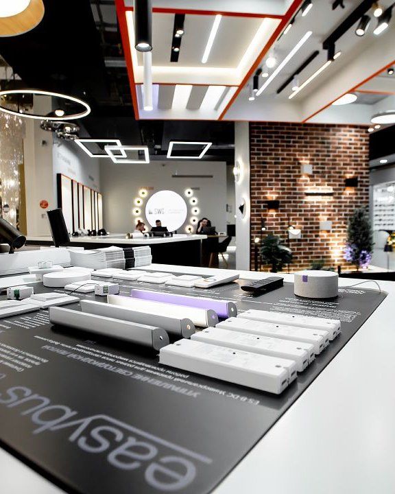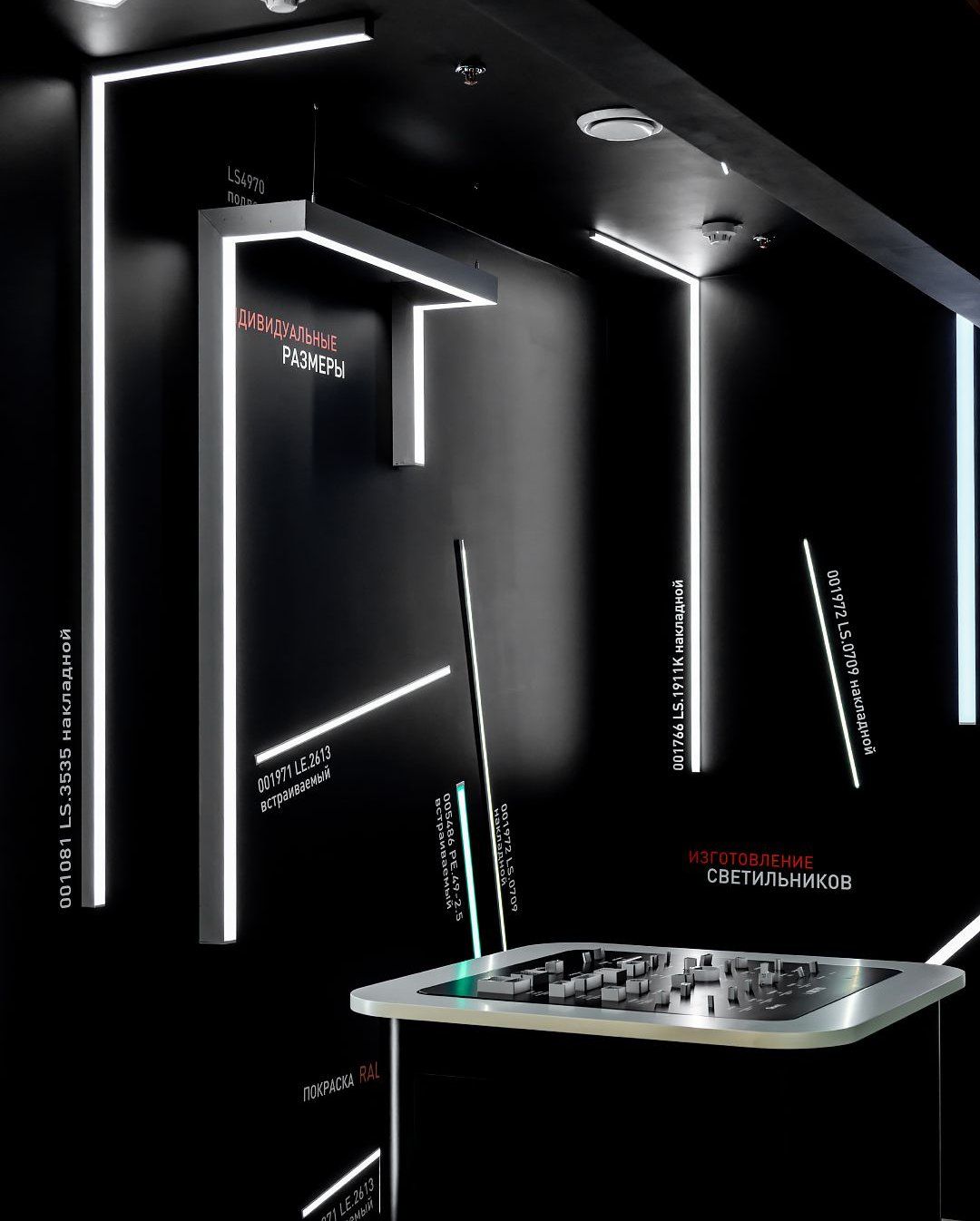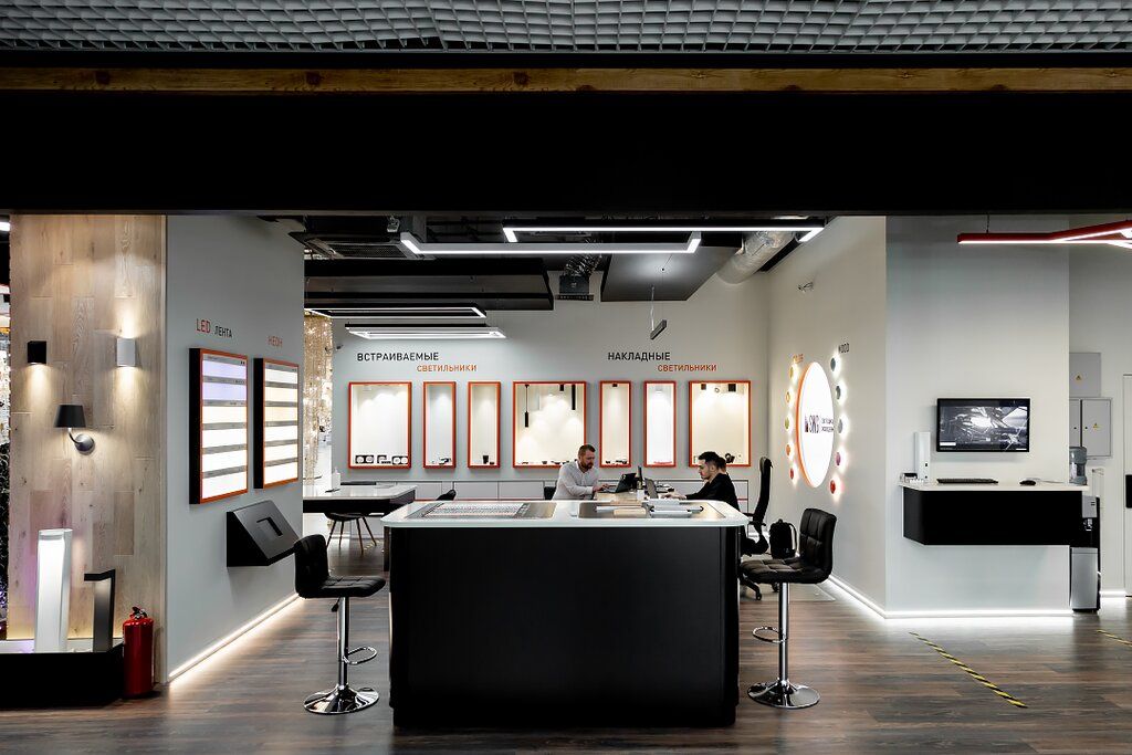 Магазин сделан как «лаборатория»: в центре — большой стол с образцами, вокруг — стенды с разделением на типы светильников (в том числе встраиваемые и накладные) и примеры линейного света. По экспозиции легко оценить: как выглядит рамочный/линейный свет, что даст акцент на стене, и как разные форм-факторы работают в реальном помещении.