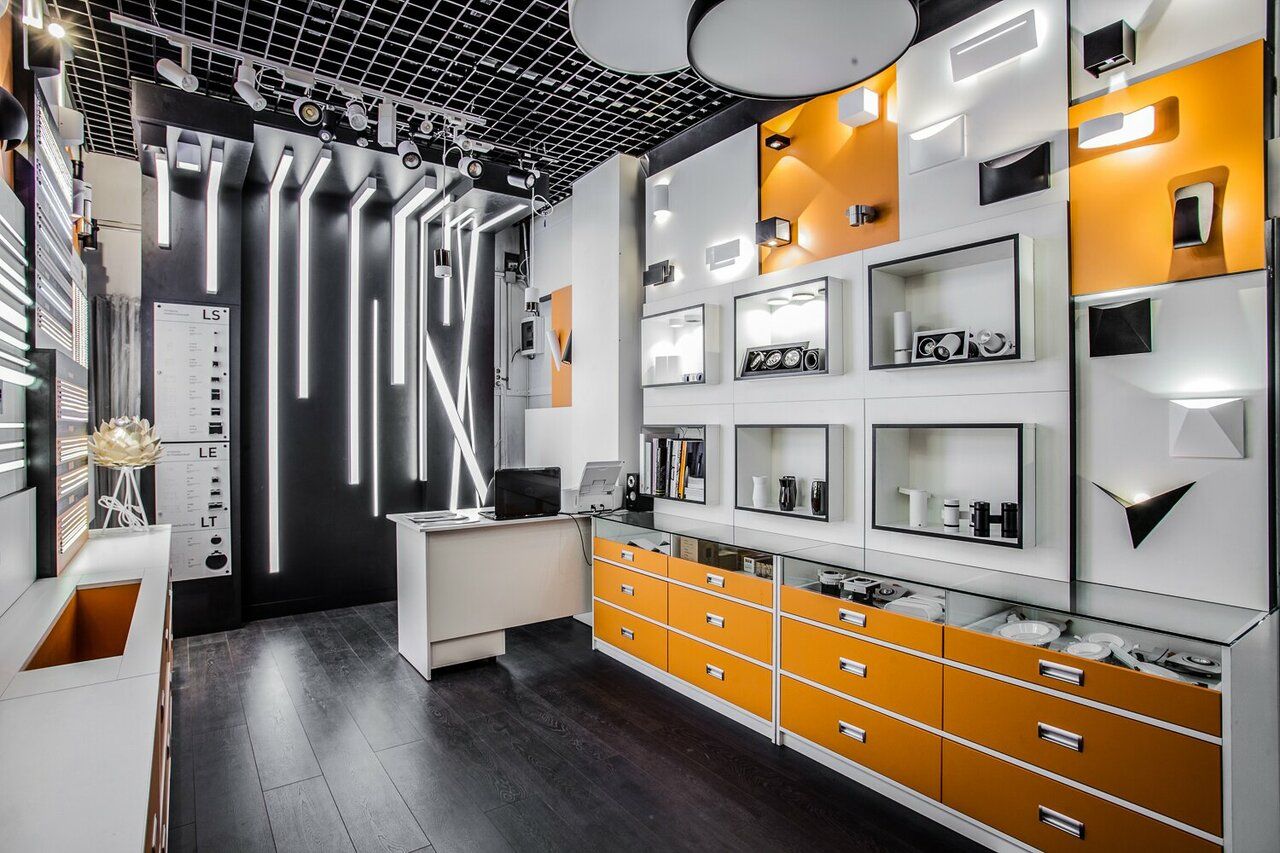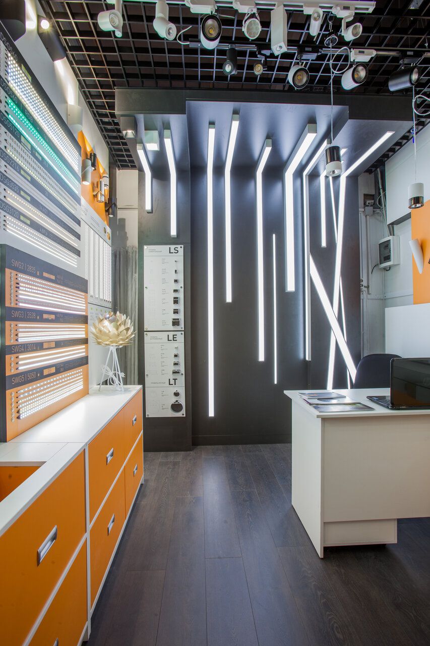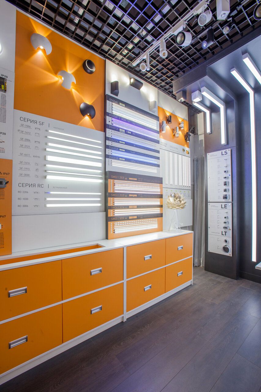 Шоурум выполнен как открытая витрина-павильон, где сразу видны стенды с большим набором форм-факторов (включая встраиваемые и накладные решения) и зоны с “живыми” примерами света. Это хорошо подходит, когда нужно быстро определиться с типом светильника и понять, как выглядит засветка.