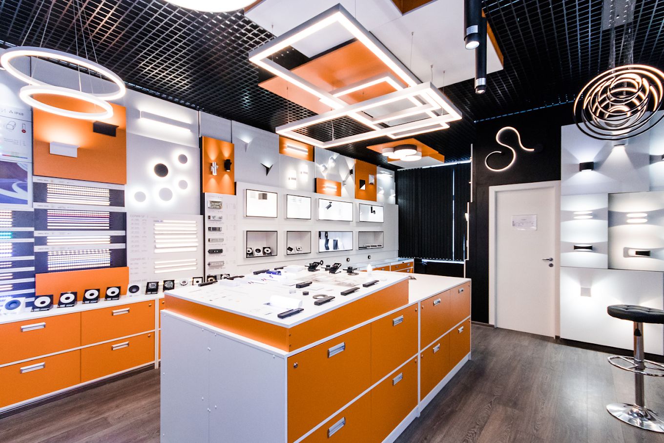 В магазине есть демонстрационные зоны: удобно оценить световые линии, декоративные элементы и разные типы светильников вживую — как они выглядят в интерьере и какой дают «рисунок» света. Под задачи вроде подсветки кухни/ниши/витрины или основного света в комнате можно собрать комплект целиком: подобрать подходящую ленту и профиль, питание с запасом и управление (диммирование/сценарии), чтобы результат совпал с ожиданиями.