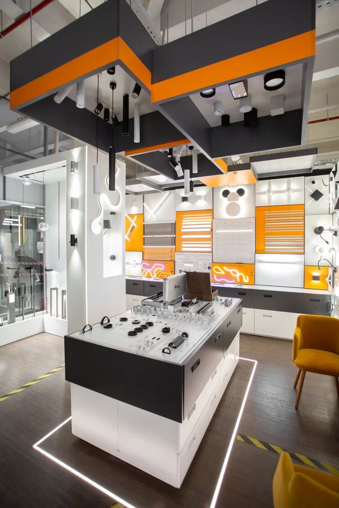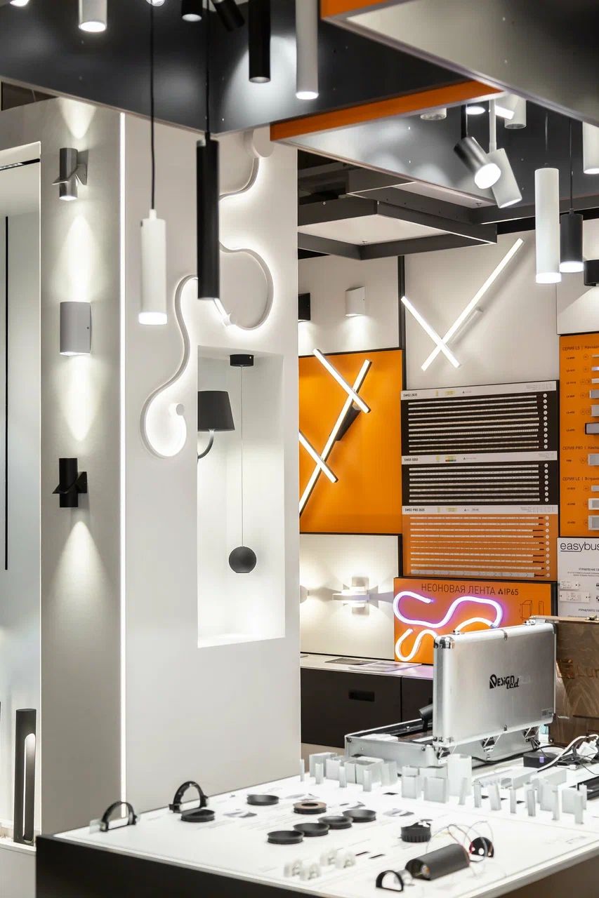 Экспозиция с включёнными стендами и рабочей зоной: можно подобрать свет под ремонт/дизайн-проект и сразу проверить, как будет выглядеть выбранное решение.