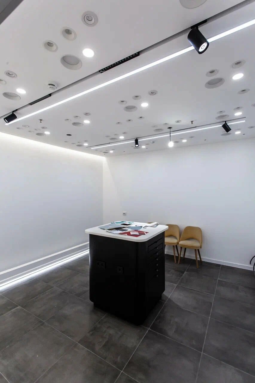 В «Кубатуре» шоурум выглядит как полноценная лаборатория: просторный зал, несколько демонстрационных столов с образцами комплектующих и зоны со включёнными светильниками (в том числе декоративными/подвесными и линейными решениями). Это помогает быстро понять, что даст акцентный свет, как выглядит рассеивание и какой формат лучше под вашу задачу.